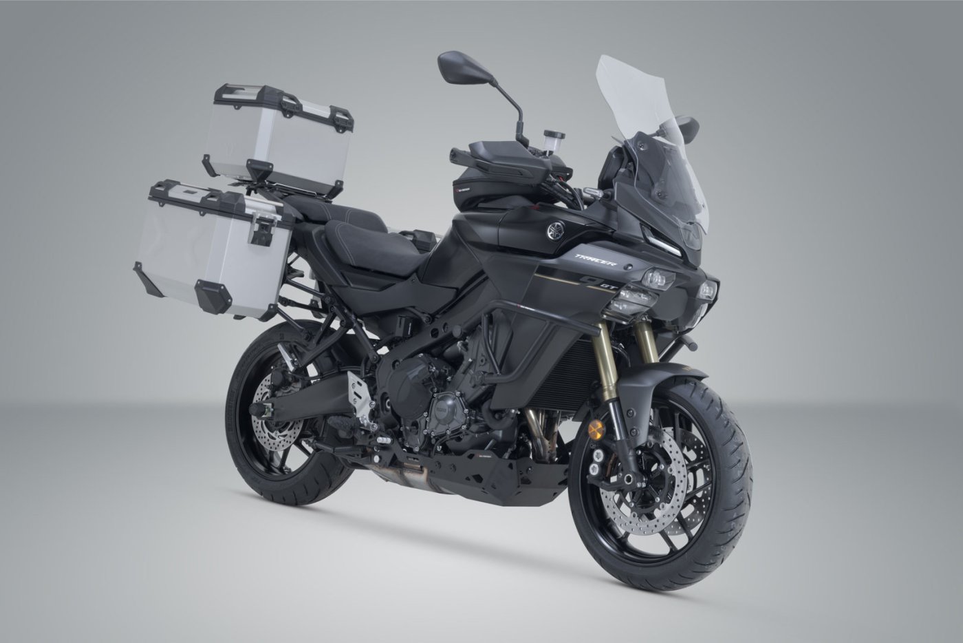 Dobrodružná sada TRAX ADV obsahuje odpovídající boční nosiče PRO a ADVENTURE-RACK pro Yamaha Tracer 9 / GT / GT+. Boční nosič a nosič jsou připevněny k upevňovacím bodům specifickým pro kolo a nabízejí pevnou oporu pro černá hliníková pouzdra TRAX ADV.
