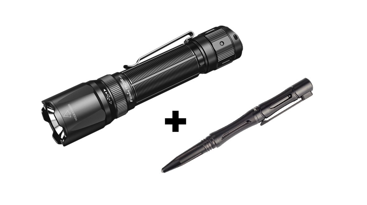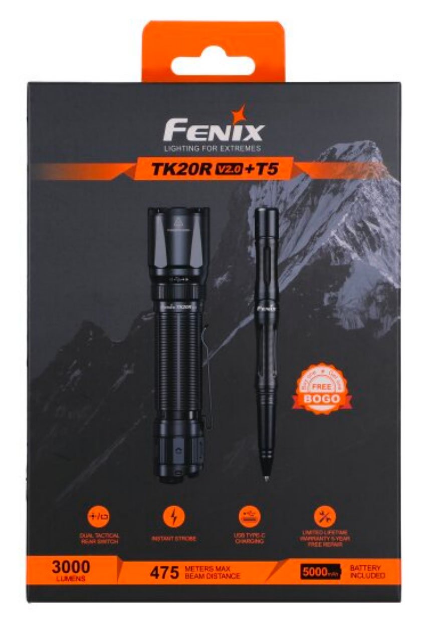 Cenově zvýhodněná sada taktické svítilny Fenix TK20R V2.0 a taktického pera T5 v černé barvě.