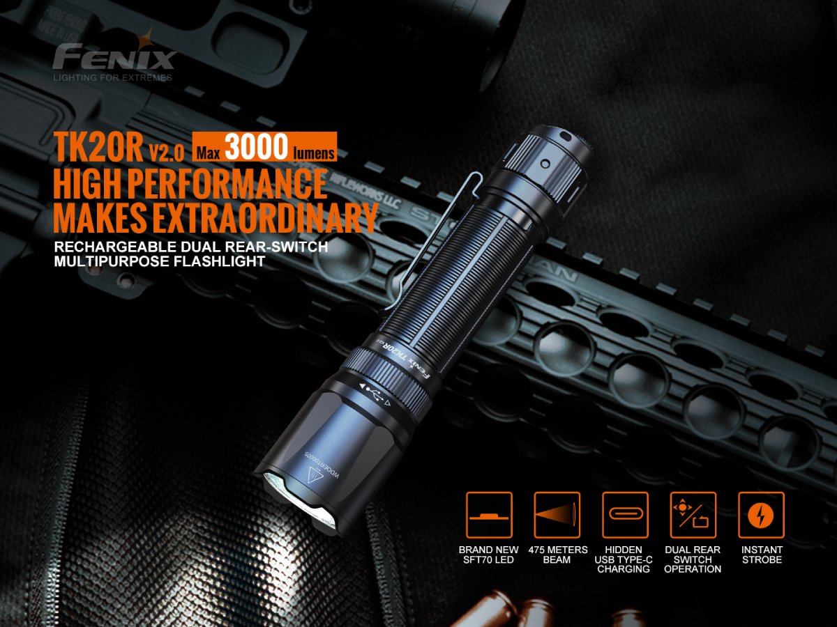 Taktická nabíjecí svítilna Fenix TK20R V2.0 nabízí světelný tok až 3000 lumenů (ANSI), nabíjení přes moderní USB-C konektor a možnost okamžité aktivace stroboskopu. Je osazená špičkovou LED Luminus SFT-70, která v kombinaci s hladkým reflektorem vytváří dobře zaostřený světelný kužel s mimořádným dosvitem 475 metrů. Součástí balení je Li-ion akumulátor 21700 s kapacitou 5000 mAh, který se nabíjí přes USB-C konektor přímo ve svítilně. Nabíjecí zdířka je krytá šroubovací maticí, takže je dokonale chráněna proti vodě a nečistotám. Svítilna Fenix TK20R V2.0 používá duální taktický spínač, který umožňuje rychlejší a spolehlivější ovládání v krizových situacích. Lze ji například rychle zapnout přímo do stroboskopického režimu. Svítilna disponuje celkem šesti režimy osvětlení s výdrží až 48 hodin.Tato taktická svítilna je díky svému masivnímu provedení pevná jako tank a přitom si zachovává kompaktní velikost. Robustní provedení umožňuje použití svítilny na dlouhých zbraních, takže je vhodná pro profesionály, ozbrojené složky a myslivost.