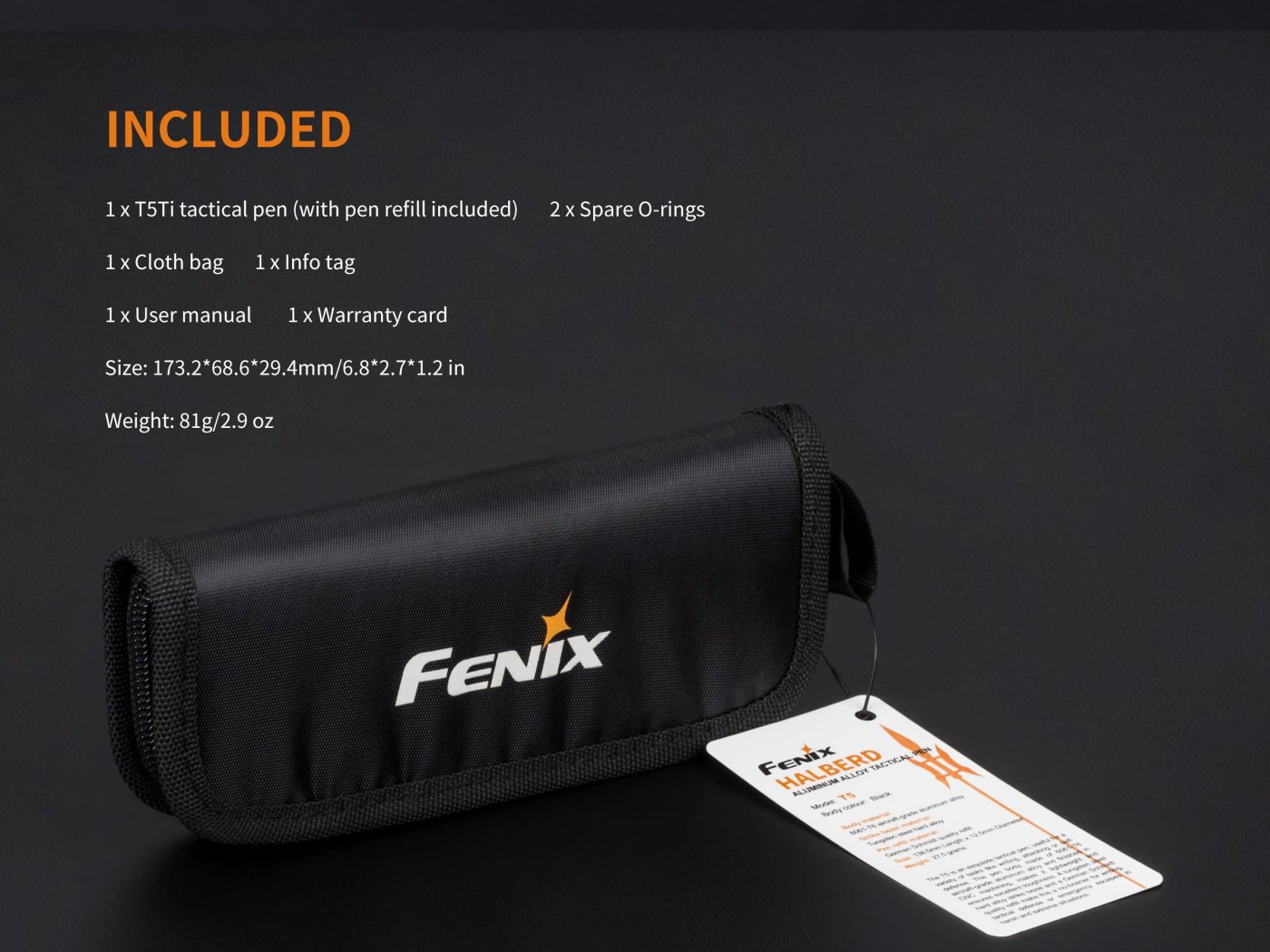 - Se svítilnou je kompatibilní i následující příslušenství: rychloupínací montáž na lištu ALG-15, rychloupínací montáž na lištu ALG-00, montáž na M-LOK Fenix ALG-16, montáž na hlaveň Fenix ALG-18, kovová magnetická montáž na hlaveň, plastová magnetická montáž na hlaveň, montáž svítilny na optiku, kovová montáž na optiku, popruh Fenix ALD-05 pro použití svítilny na přilbě, držák na kolo FB-1, držák na kolo Fenix, náhradní náplň do taktického pera T5.