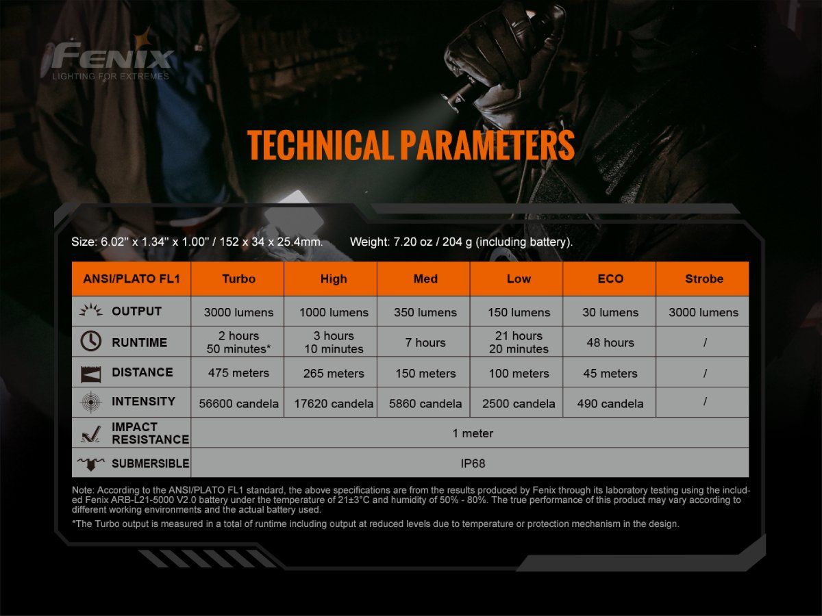 Všechny parametry policejní svítilny (světelný tok, doba provozu na baterie, vodotěsnost, dosvit a nárazuvzdornost) jsou změřeny v souladu s normou ANSI/NEMA FL 1-2009.