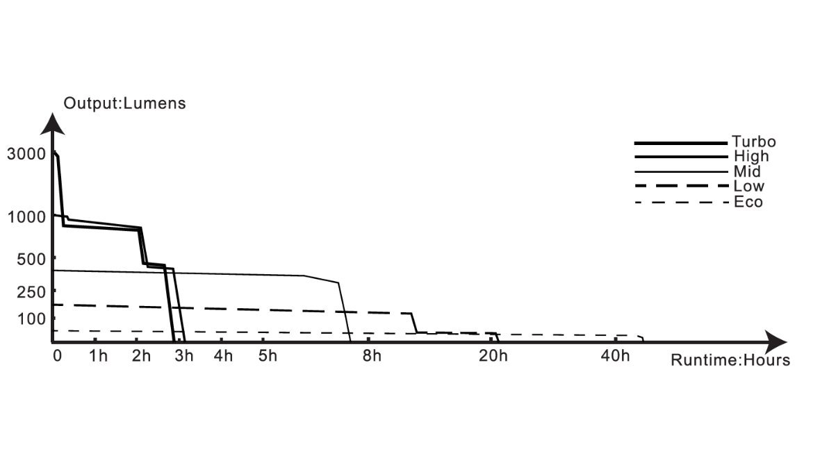 - Šest režimů výkonu: - 3000 lumenů (2,8 hodiny) -> 1000 lumenů (3,1 hodin) -> 350 lumenů (7 hodin) -> 150 lumenů (21,3 hodiny) -> 30 lumenů (48 hodin) ->stroboskop 3000 lumenů.