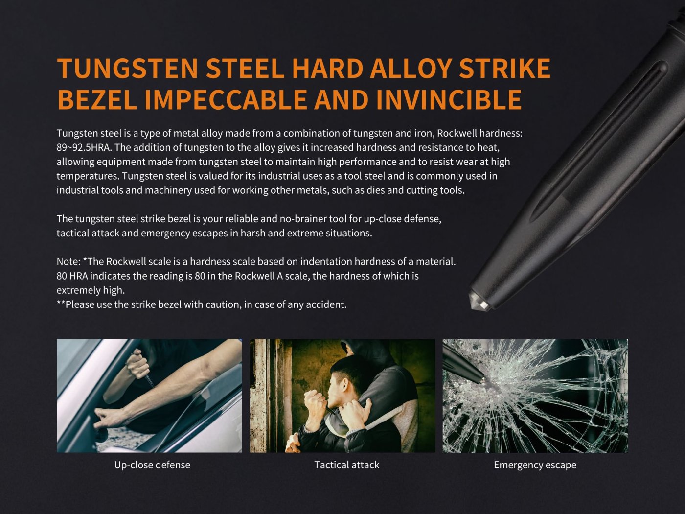 - Tělo svítilny vyrobeno z leteckého tvrzeného hliníku, hlava svítilny je doplněna o úderný ráfek v černé barvě.