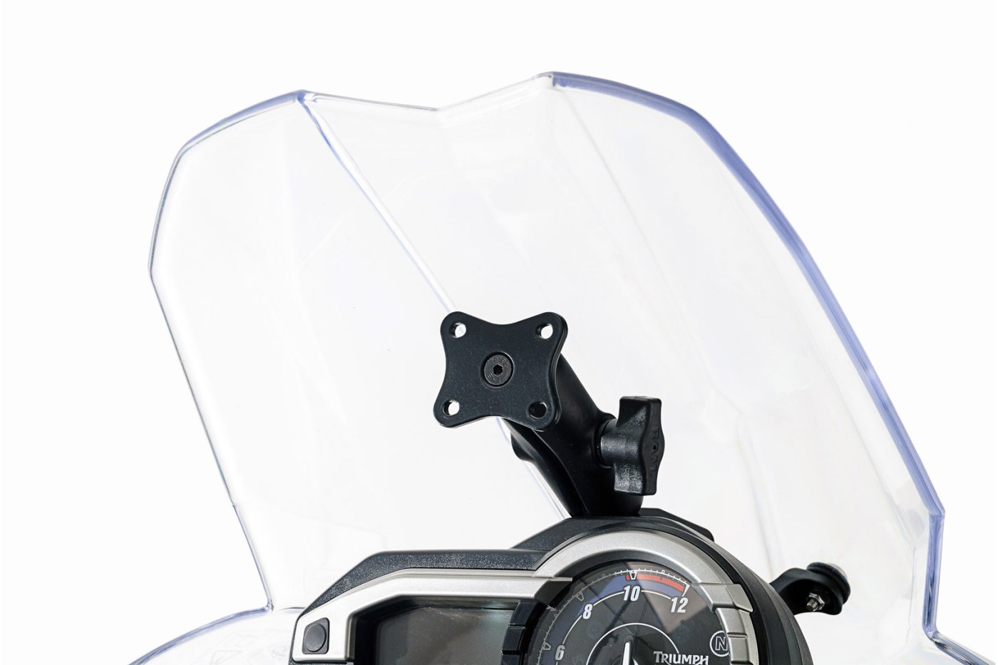 Otočné rameno zásuvky umožňuje optimální polohování zařízení GPS. Držák GPS s univerzálním vrtacím otvorem umožňuje bezpečné připojení mnoha současných modelů zařízení GPS, jako jsou pouzdra zařízení Navi Case Pro a tvrdé skříně pro smartphony od SW-MOTECH.