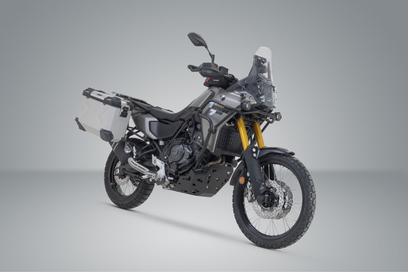 Společnost SW-MOTECH postavila systém stříbrných hliníkových skříní vhodný pro model Yamaha Ténéré 700 s extrémně odolnými bočními nosiči PRO specifickými pro jízdní kola.