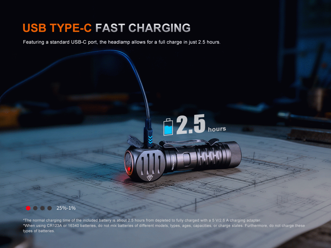 - Běžná doba nabíjení je 2,5 hodiny s USB zdrojem 5 V/2 A pro zcela vybitou čelovku. Během nabíjení lze čelovku používat, ale doba nabíjení se tím prodlouží a dostupné režimy výkonu závisí na aktuálním stavu nabití baterie.