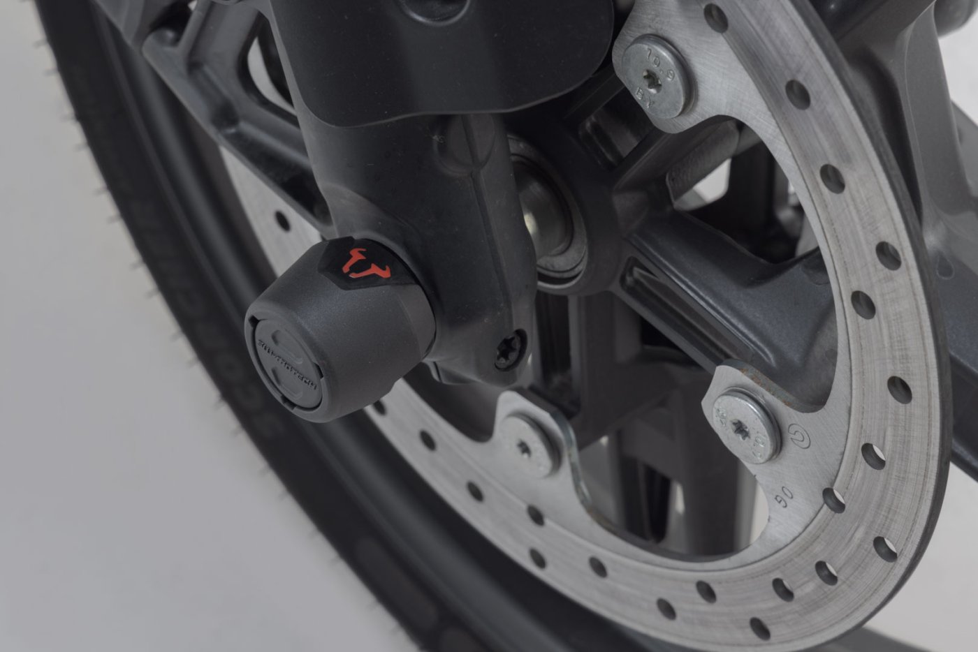 Nárazové podložky přední nápravy vyrobené z otěruvzdorného plastu chrání hnací hřídel před poškozením v případě pádu. Hladký povrch také poskytuje vynikající kluzné vlastnosti. Leštěné logo býka v červené barvě dodá vašemu motocyklu vizuální zvýraznění.