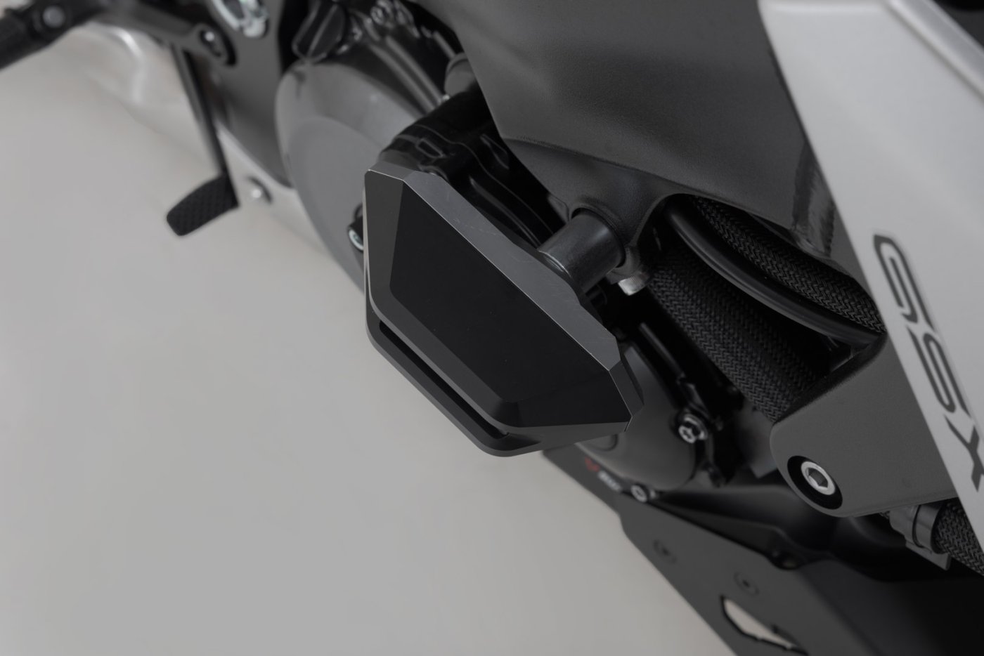 Rámové padací podložky poskytují dodatečnou ochranu v případě pádu. Tvar, povrch a materiál destiček poskytují vynikající kluzné vlastnosti, které snižují poškození motocyklu. Robustní hliníkový montážní držák se snadno instaluje a otěruvzdorné CNC frézované posuvné podložky jsou vyměnitelné.