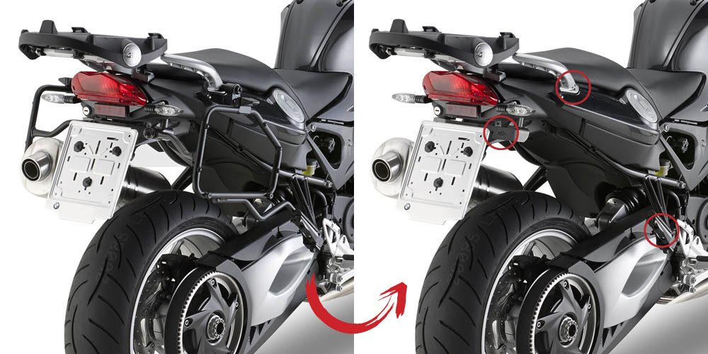 PLR - trubkový nosič bočních kufrů, určeno pro kufry MONOKEY. Tento nosič je rychle demontovatelný pomocí dodávaného speciálního klíče, na motrocyklu zůstanou pouze 3 úchytné prvky. Má tříprvkové uchycení kufru k nosiči, je velmi stabilní. Kufry kupte samostatně v sekci Zboží - kufry GIVI - Monokey boční, nebo Monokey. Doporučujeme použití kufrů TRK 33 nebo 46, lze samozřejmě použít i E 41 Keyless (maximální objem - 2x41 litrů), E 360 (malá šířka motocyklu s kufry - 2x40 l.), případně E 21 Cruiser (malý rozměr - malý objem - 2x21 l.).