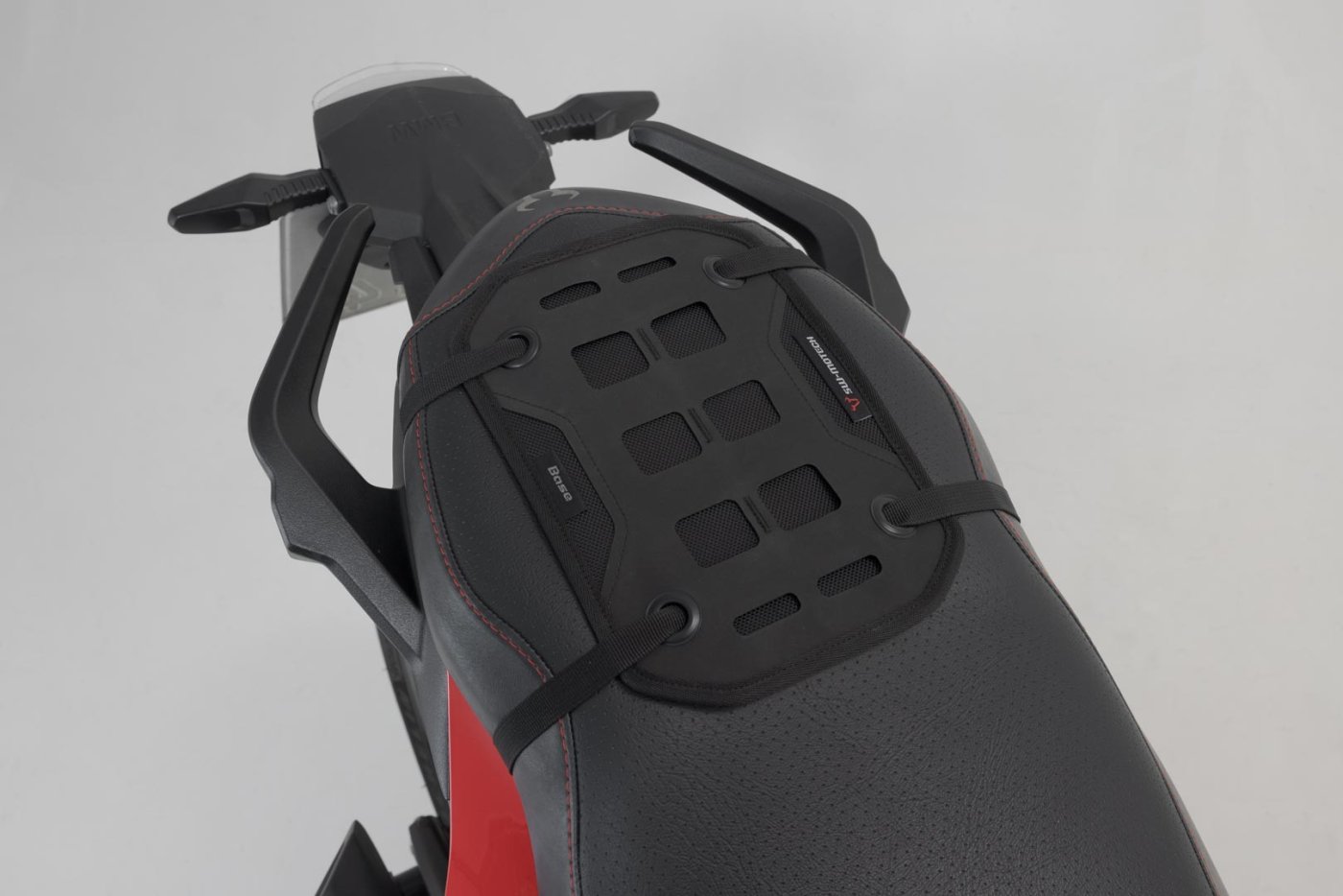PRO Base je dokonalým řešením pro flexibilní přepravu malých zavazadel na sedadle spolujezdce. Systém MOLLE vyrobený z robustní tkaniny hypalon je přišit k balistickému nylonovému základu a může být připevněn k sedadlu pomocí přiložených upevňovacích popruhů. Za tímto účelem jsou popruhy protaženy čtyřmi kovovými očky. Systém MOLLE poskytuje bezpečnou podporu pro tašky na příslušenství, jako je PRO Plus nebo kapsa PRO. Ty lze připevnit a připevnit pomocí T-Locku (k dostání zvlášť).