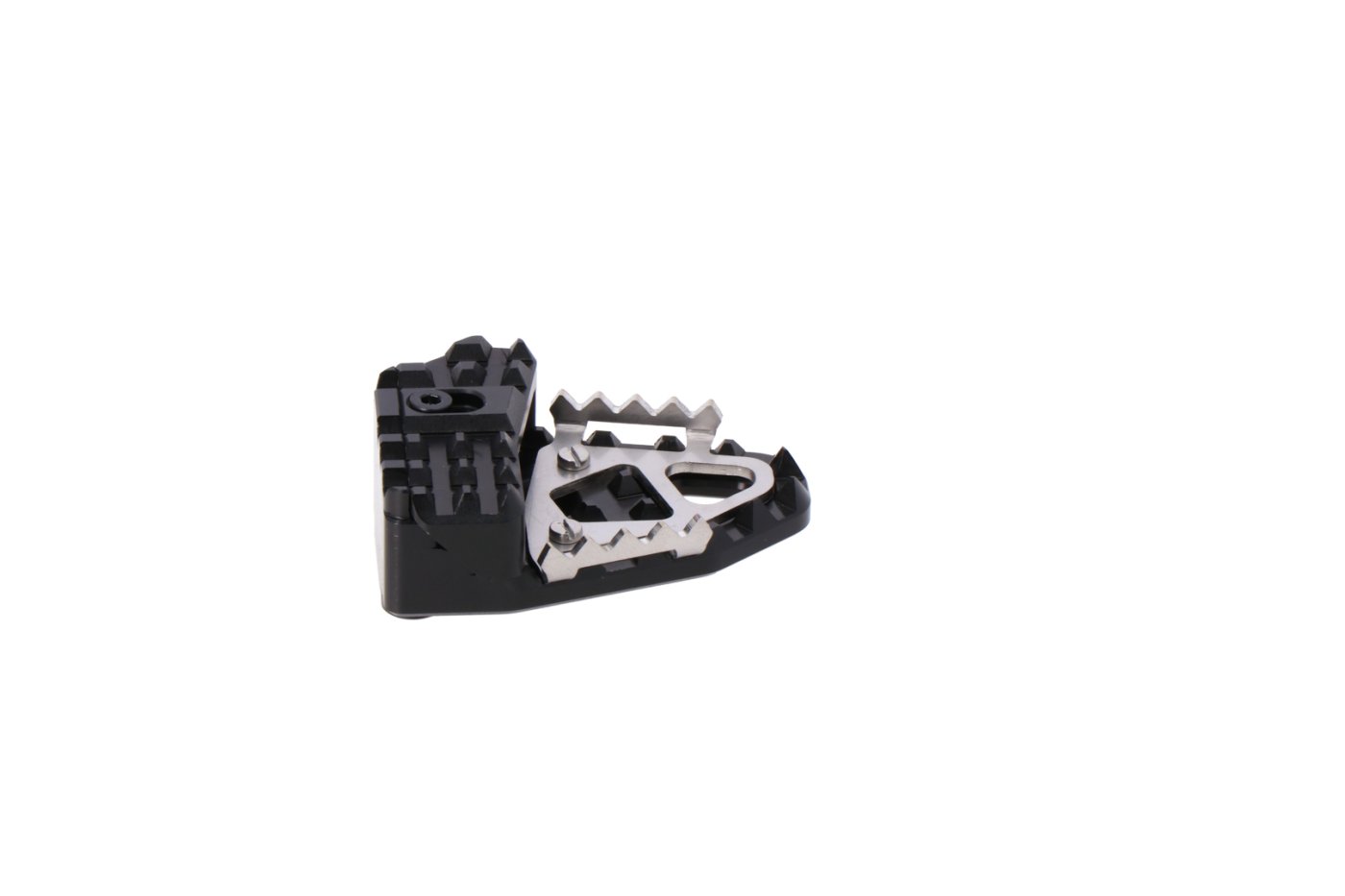 SW-MOTECH vyrábí tato rozšíření z vysoce pevné frézované hliníkové slitiny; Mají černý eloxovaný povrch a nášlapnou desku z nerezové oceli. Pro optimální ergonomické nastavení lze zvýšení kroku brzdového pedálu nastavit ve dvou stupních po 22 nebo 27 milimetrech.