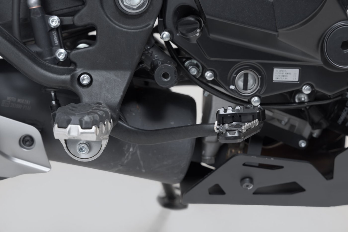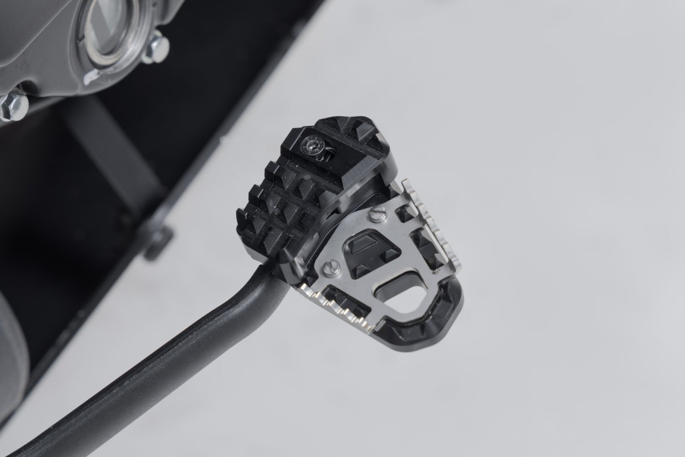 SW-MOTECH vyrábí tyto nástavce z vysoce pevné frézované hliníkové slitiny; Mají černý eloxovaný povrch a schůdkovou desku z nerezové oceli. Pro optimální ergonomické nastavení lze zvýšení kroku brzdového pedálu nastavit ve dvou stupních po 22 nebo 27 milimetrech. Prodloužení brzdového pedálu je ideální pro jízdu v terénu: zlepšuje běhoun originálního brzdového ramene a zaručuje bezpečné a kontrolované používání brzdy. Prodloužení umožňuje, aby kontaktní plocha byla širší i vyšší. To znamená, že prodloužení brzdového pedálu nabízí lepší bezpečnost a lepší kontrolu nad zadní brzdou. Při jízdě v terénu často střídáte polohu vsedě a vestoje. Při stání se mění úhel kolena, takže noha nemůže vyvíjet takový tlak na menší pedál. Díky zvýšené kontaktní ploše je vaše noha nakloněna ostřeji, takže může snadněji dosáhnout a ovládat rameno brzdy, i když stojí. K dispozici jsou dvě nastavení výšky. Kromě zvýšené plochy má prodloužení brzdového pedálu rozšířenou kontaktní plochu. Je vybaven vroubkovaným povrchem, takže nabízí lepší přilnavost, když je povrch ramene špinavý nebo mokrý.