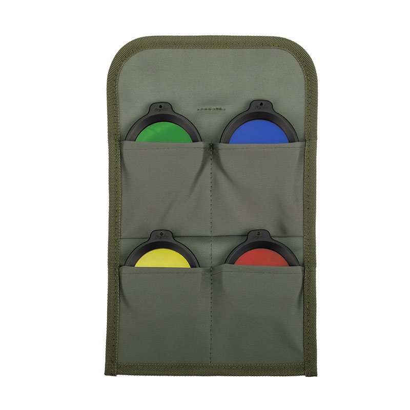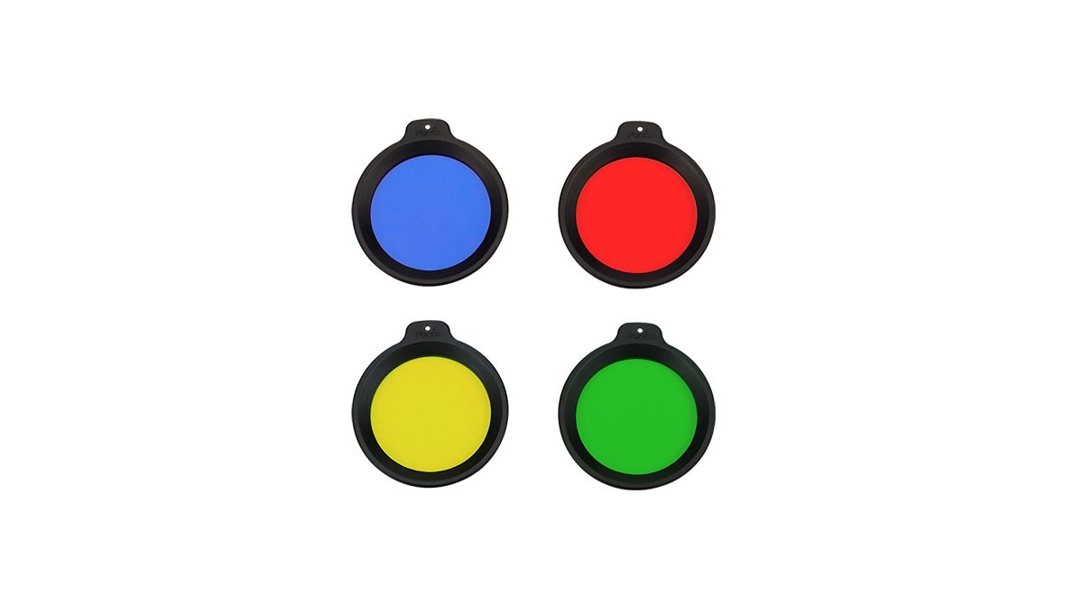 Sada barevných filtrů pro svítilny Fenix HT18, Fenix HT18R a Fenix HT18R V2.0. V balení je červený, zelený, modrý a žlutý filtr.