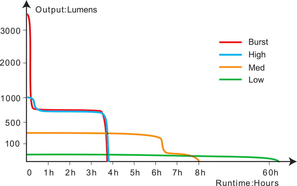 - Pět režimů výkonu: burst 3600 lumenů (3 h 45 min) -> 1000 lumenů (3 h 50 min) -> 350 lumenů (8 hodin) -> 30 lumenů (60 hodin) -> stroboskop 3000 lumenů (stroboskopické blikání s proměnlivou frekvencí).