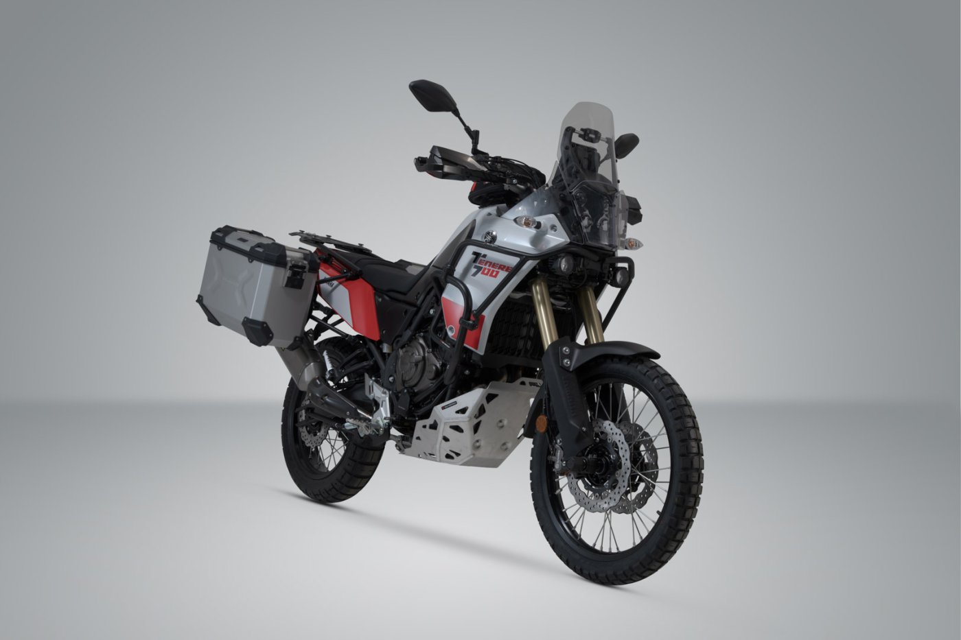 SW-MOTECH postavil stříbrný hliníkový systém pouzder vhodný pro Yamaha Ténéré 700 s extrémně odolnými bočními nosiči PRO specifickými pro jízdní kola.