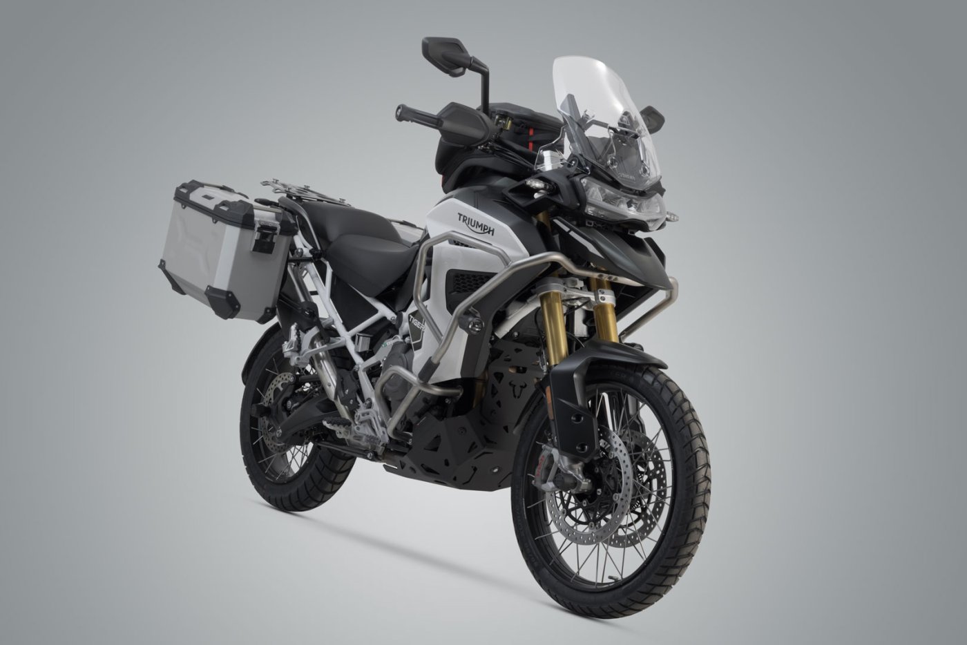SW-MOTECH vyrobil tento stříbrný hliníkový systém kufru vhodný pro Triumph Tiger 1200 Rally / GT Explorer s použitím extrémně odolných bočních nosičů PRO specifických pro kola.