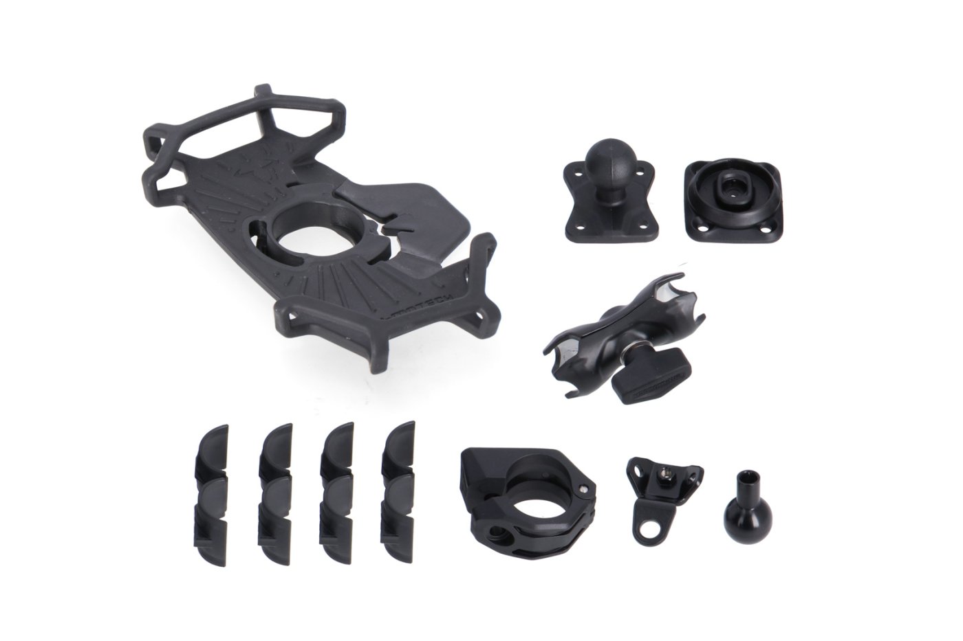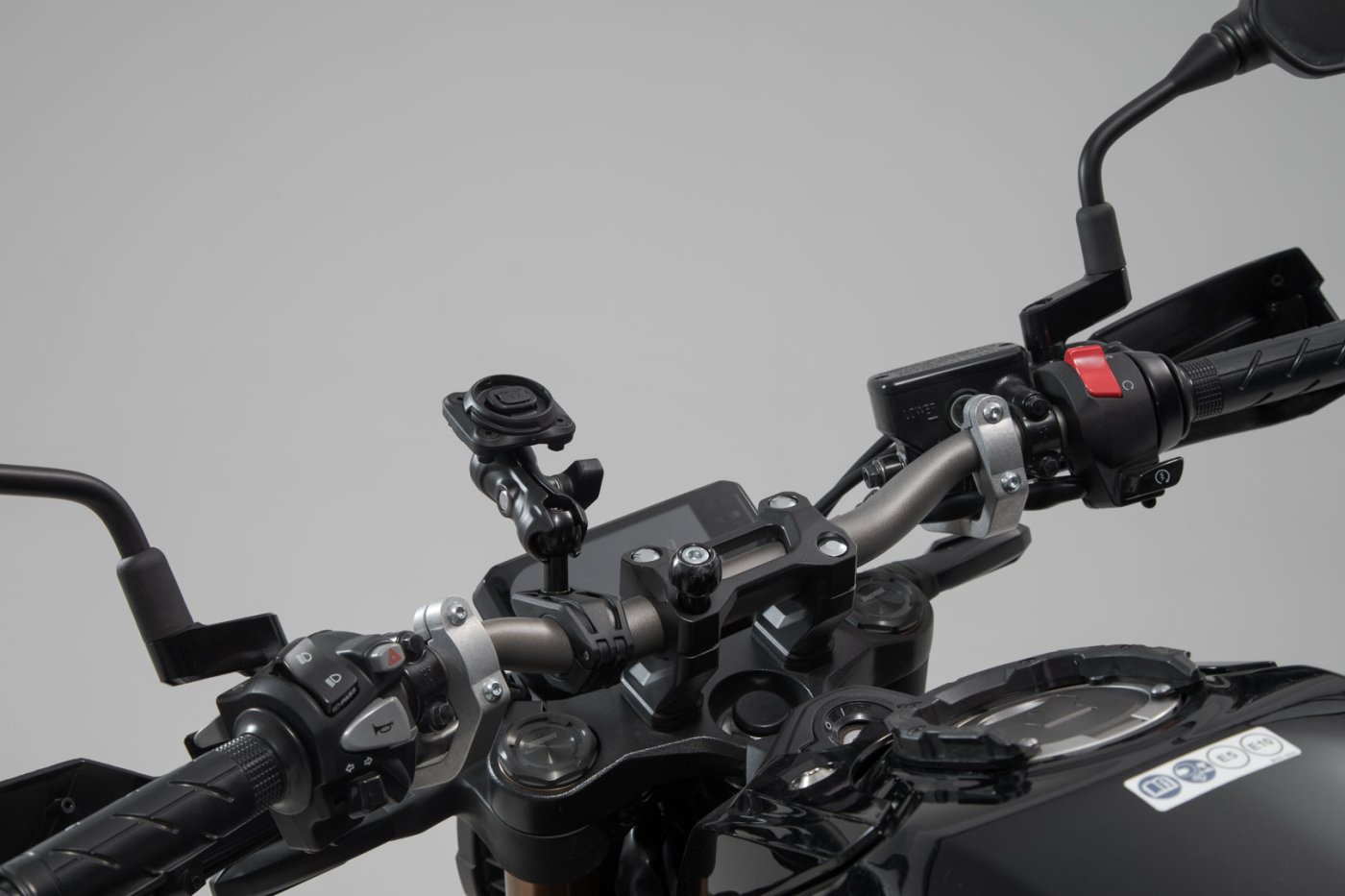 Naše univerzální sada nabízí řadu různých možností montáže na motocykl: dodávanou kuličku 1 palce lze namontovat na závit M6 nebo M8, držák závitu zrcadla nebo montážní svorku. Montážní svorka je určena pro řídítka o průměru 22,28 mm nebo 1 in. Otočné rameno s nástrčnou hlavou usnadňuje umístění v kokpitu - displej tak zůstává vždy na očích, aniž by bránil ve výhledu přístroji. Držák T-Lock s držákem smartphonu je součástí dodávky a umožňuje rychlé připojení chytrých telefonů k sadě Universal Navi. Držák T-Lock lze upevnit k ramenu zásuvky otočením o čtvrt otáčky ve směru hodinových ručiček. Silikonové pásky na držáku smartphonu se používají k připevnění zařízení různých velikostí.