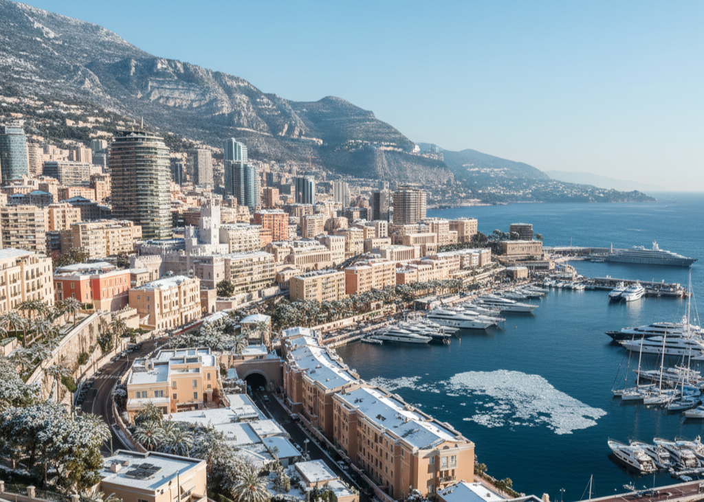 Monako má typické středomořské podnebí s horkými, suchými léty a mírnými, vlhkými zimami. Průměrné letní teploty se pohybují kolem 25-30 °C, zatímco v zimě klesají k 10-15 °C. Sněžení je v Monaku velmi vzácné. Slunečné dny převažují po celý rok, i když občasné dešťové přeháňky se mohou vyskytnout, zejména na podzim a v zimě. Díky své poloze na Azurovém pobřeží je Monako chráněno před silnými větry.
