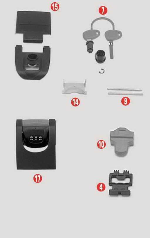 Detailní popis Z217 tlačítko upevnění kufru GIVI k nosiči pro E 360, E 460, E 41 Keyless (poz. 10)