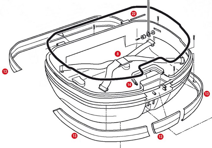 Originálně označený díl pro opravu, výměnu nebo doplnění kompatibilních kufrů GIVI. 4-dílná sada stříbrných plastů pro kufr GIVI V 46 - pozice 13.
